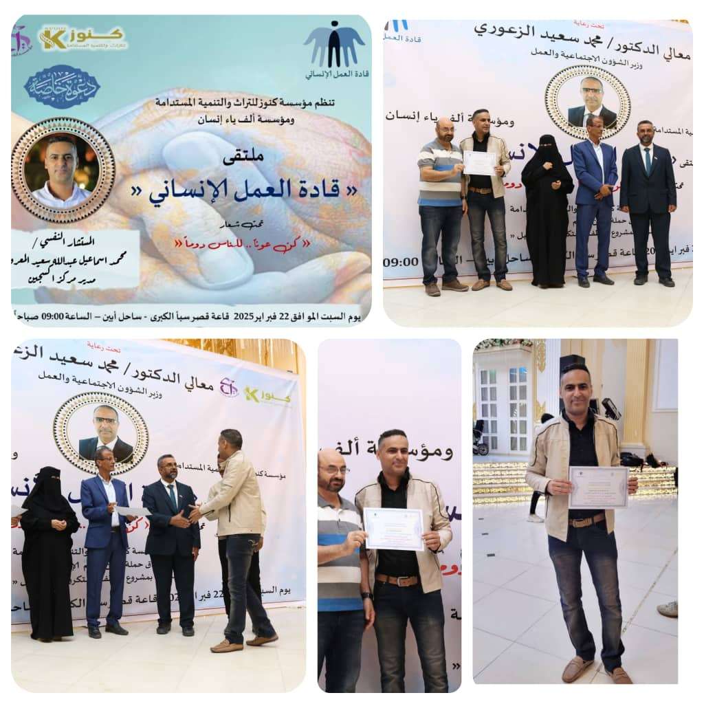 نظمت مؤسسة كنوز للتراث والتنمية المستدامة، ومؤسسة ألف ياء إنسان، ملتقى "قادة العمل الإنساني" بالعاصمة عدن، تحت شعار "كن عونا.. للناس دوماً"، والذي تزامن معه إطلاق حملة " كن معهم الخيرية"، برعاية معالي وزير الشؤون الاجتماعية والعمل الدكتور محمد سعيد الزعوري. وخلال حفل الملتقى تم تكريم مجموعة من قادة العمل الإنساني، ومن ضمنهم المستشار النفسي محمد إسماعيل عبدالله (الإيطالي) مدير مركز اكسجين حياتك للصحة النفسية بعدن، معبراً شكره وتقديره لموسسة كنوز للتراث والتنمية المستدامة، وموسسة الف ياء إنسان، على هذا التكريم لقادة العمل الإنساني، متمنيا لهم مزيداً من النجاحات والمساهمات الإنسانية القادمة. مؤكداً، بأن مثل هذه الملتقيات الإجتماعية والإنسانية مهمة لنشر الوعي والثقافة في العمل الطوعي والإنساني في المجتمع، حيث أن لايمكن ان يقام مجتمع مدني ومتحضر ولديه قيم أخلاقية إلا عن طريق النوعيات المستمرة بأهمية العمل الإنساني في المجتمع.