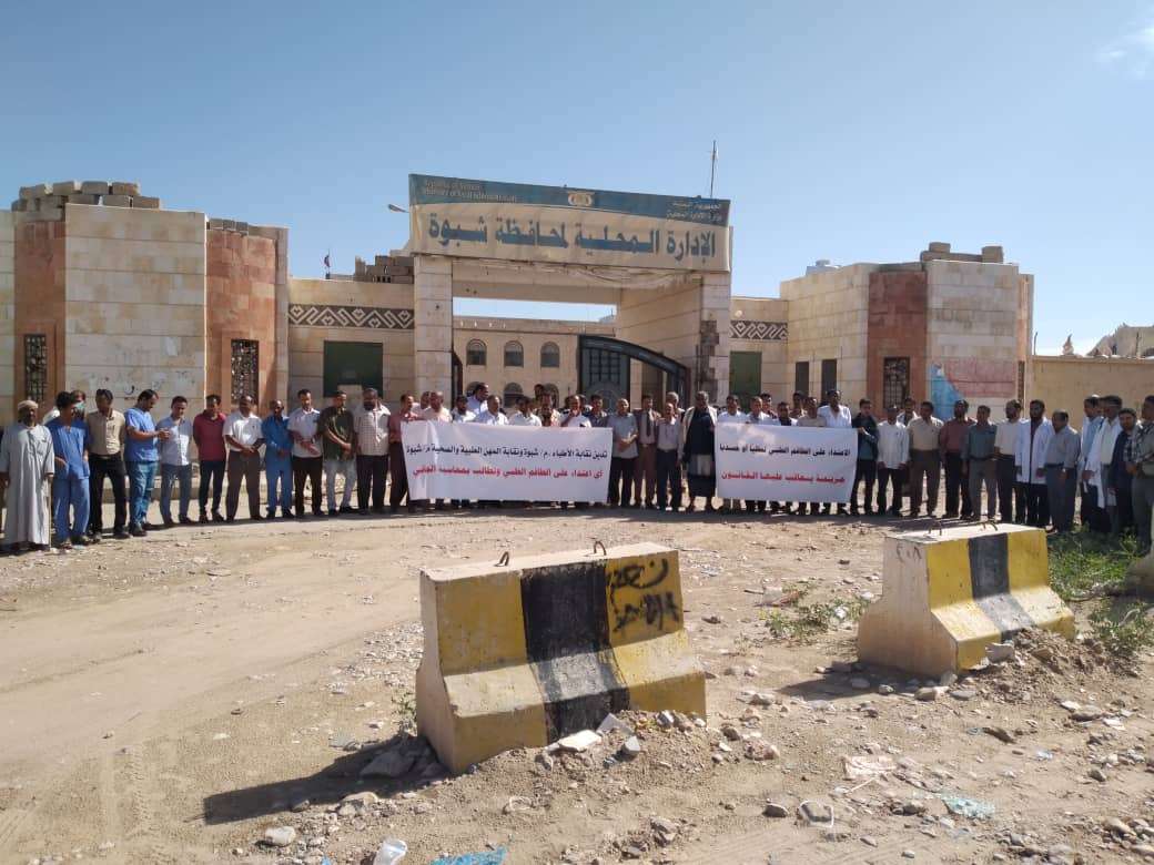 شبوة/ نقابتي الأطباء والمهن الطبية والصحية بشبوة نفذت وقفه أحتجاجية أمام ديوان عام المحافظة