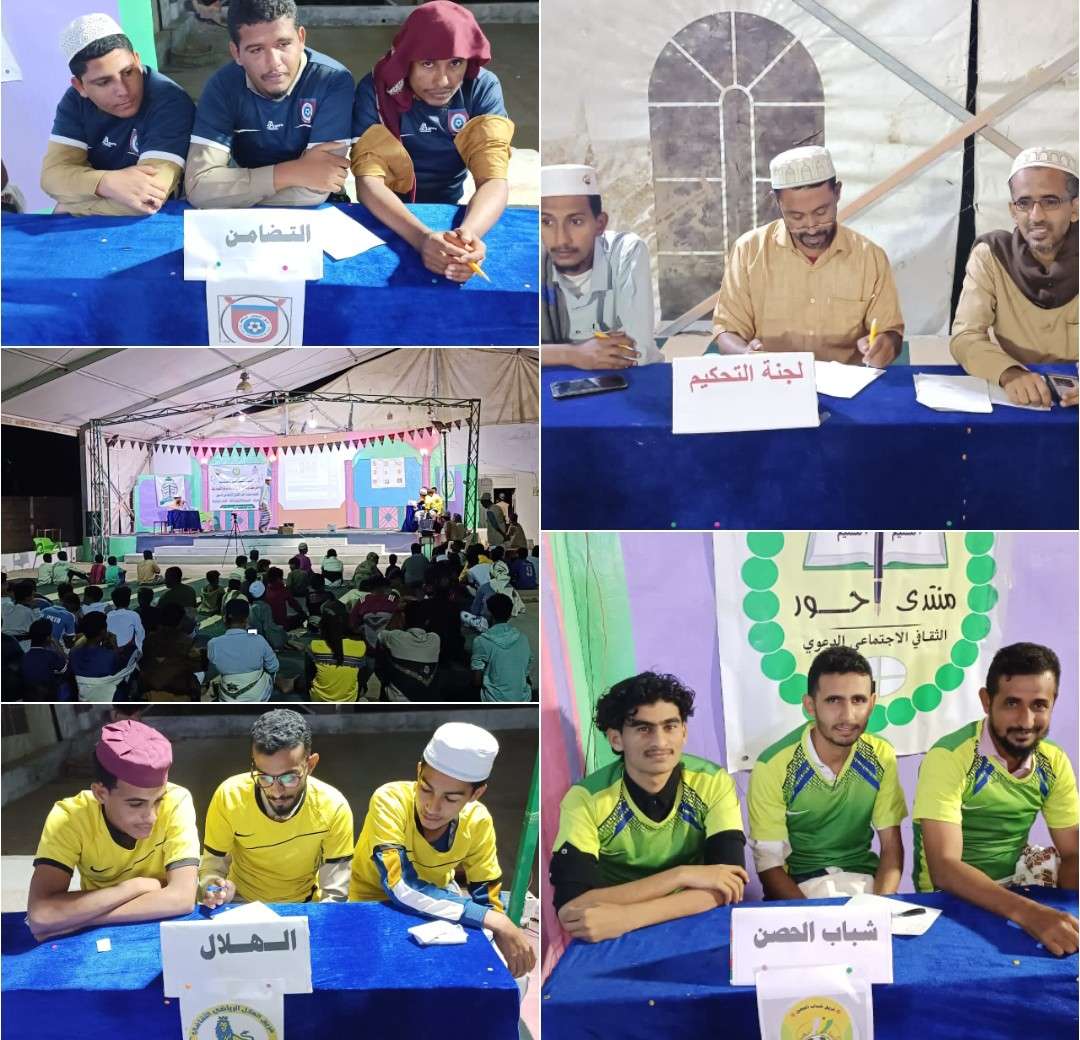 دشن منتدى أحور الثقافي الاجتماعي الدعوي، مساء أمس الإثنين، افتتاح برنامج فعالياته الرمضانية، وتضمن ذلك المسابقة الثقافية في نسختها الثامنة والعشرين للفرق الرياضية الشعبية بالمديرية، والتي تقام برعاية من مجلس مكتب الموجه العام لأربطة التربية الإسلامية. وقد خاضت فرق المجموعة الأولى غمار منافسات اليوم الأول للمسابقة، وهم فريق شباب الحصن وفريق التضامن وفريق الهلال. وتكونت المسابقة من ثلاث جولات: الجولة الأولى في الإسلاميات، والجولة الثانية في المعلومات العامة، والجولة الثالثة في المجال الرياضي، بإجمالي 100 درجة لجميع الجولات. حيث حقق فريق شباب الحصن المركز الأول برصيد 70 درجة، بينما حصل فريقي الهلال والتضامن على المركز الثاني ب 50 درجة لكل منهما، ليتأهل فريق شباب الحصن إلى الدور القادم، فيما ودع فريقا الهلال والتضامن المسابقة. وشهدت أمسية الافتتاح لقاء رياضي مع الكابتن أحمد صالح كرامة، أحد أبرز النجوم الرياضية الشابة في مديرية أحور، حيث حاوره الأستاذ ناصر سالم بامهيد. تركز اللقاء حول مسيرة اللاعب الرياضية في أحور وخارجها، وأهم المحطات الرياضية التي عاشها اللاعب الشاب متنقلا بين أندية الدرجة الأولى. وتخللت فعاليات المسابقة الثقافية سحوبات على ملابس رياضية مقدمة من منتدى أحور، وكروت شبكات واي فاي مقدمة من شبكة ماكس، وجهاز MP3 مقدمة من محلات عقبة للجولات. كما تم تقديم أسئلة للمجمهور، التي نالت استحسان وتفاعل الجماهير الحاضرة، وقدمت فيها العديد من الجوائز العينية.