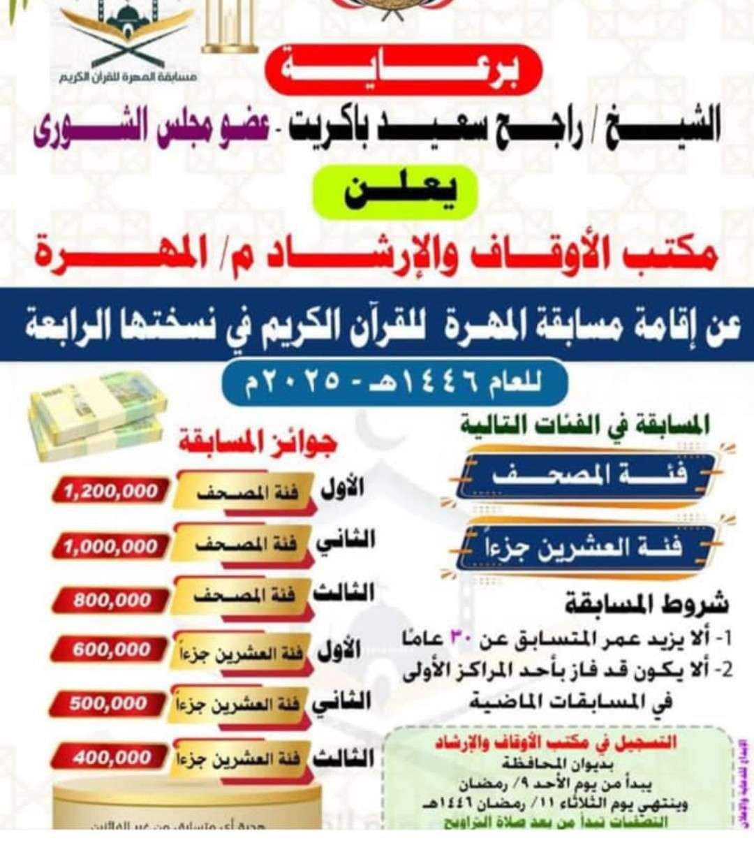 أعلن مكتب الأوقاف والإرشاد بالمهرة عن إقامة مسابقة المهرة للقرآن الكريم في نسختها الرابعة للعام ١٤٤٦هـ - ٢٠٢٥م والتي تأتي هذه المسابقة برعاية الشيخ راجح سعيد باكريت عضو هيئة رئاسة المجلس الانتقالي الجنوبي. الجدير ذكره إن المسابقة هذه تعتبر المسابقة الرابعة وعلى مدى اربعة أعوام متتالية.