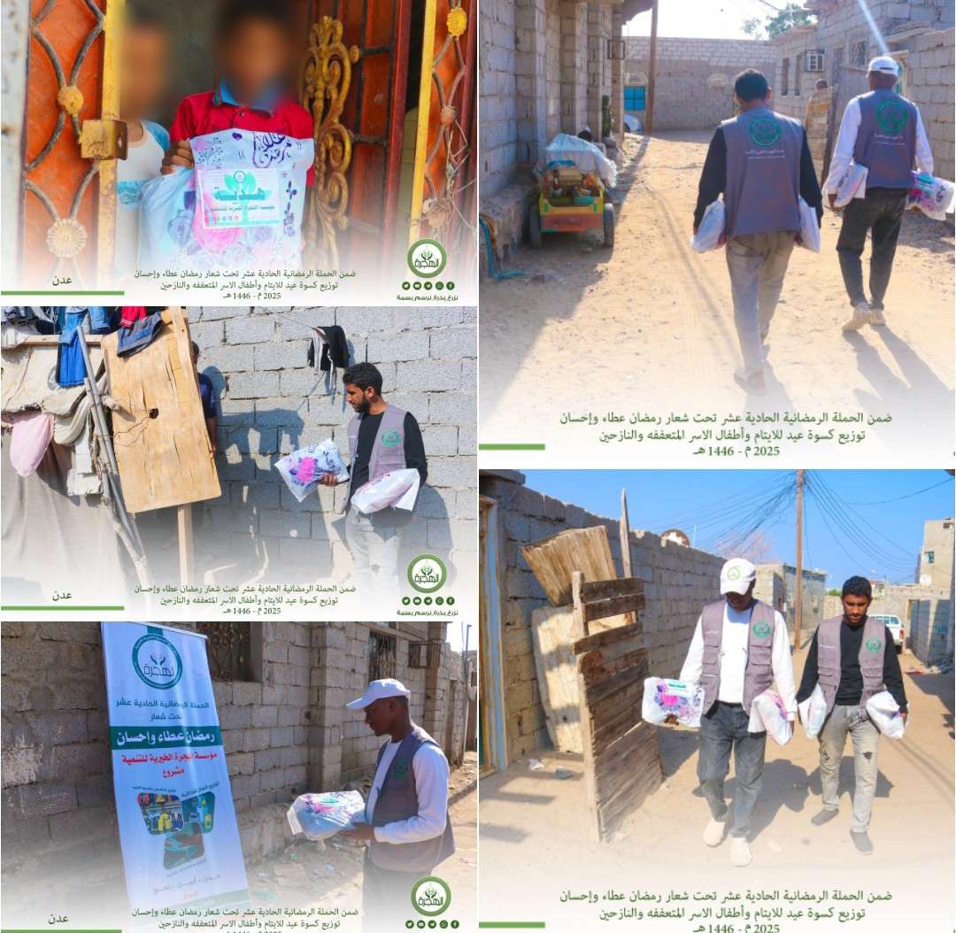 في أواخر الشهر الكريم ، تواصل مؤسسة الهجرة الخيرية للتنمية تنفيذ بقية الأعمال التي بدأت في الإعلان عنها وتدشينها في أوائل الحملة الرمضانية (رمضان عطاء وإحسان)، في عامها الحادي عشر على التوالي من هذا العام ١٤٤٦هـ - 2025م ومن ضمن تلك الأعمال الخيرية مشروع كسوة العيد ، والذي يحظى باهتمام سنوي من قبل إدارة المؤسسة في السعي وإيجاد الدعم من أهل الخير والعطاء لإنجاحه ، وقد واصلت مؤسسة الهجرة الخيرية للتنمية أعمال حملتها الرمضانية الحادية عشر بتنفيذ مشروع كسوة العيد وذلك بتوزيع المرحلة الثانية من كسوة عيد الفطر لأطفال الأسر الفقيرة والمحتاجة بمناطق العاصمة عدن . وقد بلغ عدد المستفيدين من كسوة العيد في المرحلة الثانية حوالي 1500 طفل وطفلة في بعض مناطق العاصمة عدن شملت (المنصورة والقاهرة والحسوة وكريتر والبساتين ومنطقة وديع حداد) وغيرها من مناطق العاصمة عدن . ويهدف المشروع إلى رسم البسمة في وجوه الأطفال وآبائهم الفقراء والمحتاجين وتخفيف كاهل المعاناة والظروف القاسية التي يمرون بها . يشار أن مؤسسة الهجرة نفذت العديد من المشاريع الانسانية في حملتها الرمضانية منها توزيع السلال الغذائية وتوزيع التمور ووجبات إفطار وإشباع الصائم اليومية، واستهدفت الفقراء والمحتاجين والأيتام والنازحين في عدة محافظات .