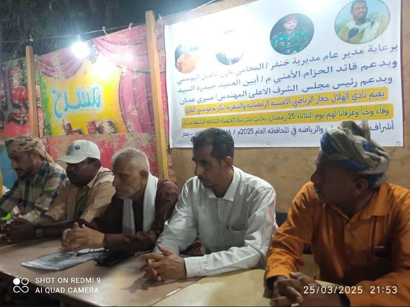 بدعم قائد الحزام الأمني بأبين العميد حيدرة السيد و رئيس مجلس الشرف الأعلى المهندس صبري عدنان و برعاية مدير عام مديرية خنفر المحامي مازن اليوسفي و إشراف مكتب الشباب والرياضة بحضور الأستاذ عبدالرحمن الشاعري رئيس إدارة الشباب والطلاب في المجلس الانتقالي في مديرية خنفر أقام نادي الهلال يوم الثلاثاء الخامس والعشرين من رمضان بجعار الأمسية الرمضانية والشعرية لتكريم مؤسسي النادي . وقال الشاعري هذه الفعالية الرمضانية تأتي لتكريم مؤسسي نادي الهلال ومن خدم النادي منذ التأسيس والذي كان في سبعينات القرن الماضي. مقدما شكره لإدارة نادي الهلال جعار على مثل هذه الأمسيات الرمضانية الرياضية منها والثقافية في شعر رمضان المبارك ، وفعالية اليوم فعالية متميزة في رد الجميل والوفاء والعرفان لكل من خدم نادي الهلال جعار.
