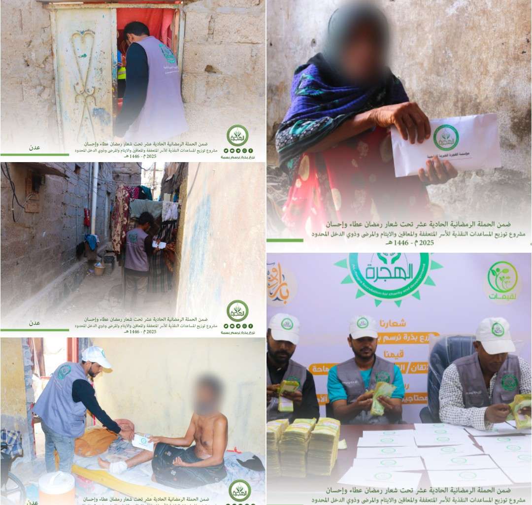 واصلت مؤسسة الهجرة الخيرية للتنمية أعمالها الرمضانية بتنفيذ مشروع المساعدات النقدية لمستحقيها والتي تنفذه كل عام بدعم وتمويل من فاعلي خير ، والذي يندرج ضمن أعمال الحملة الرمضانية الحادية عشر (رمضان عطاء وإحسان) من هذا العام ١٤٤٦هـ - 2025م. حيث شملت المساعدات توزيع أكثر من 200 ظرف نقدي، تم من خلاله استهداف مجموعة من الفقراء والمحتاجين ممن يعانون من الأمراض المزمنة والمعاقين والأيتام والنازحين ومنازل الأسر المتعففة والفقيرة في عدد من المناطق بالعاصمة عدن والذين وجدوا تفاعلاً من أهل الخير بسبب الأوضاع الإقتصادية في البلد. وتتواصل أعمال الحملة الرمضانية الحادية عشر لمؤسسة الهجرة حتى أواخر الشهر الكريم، بتنفيذ بقية الأعمال الخيرية والإنسانية للحملة.