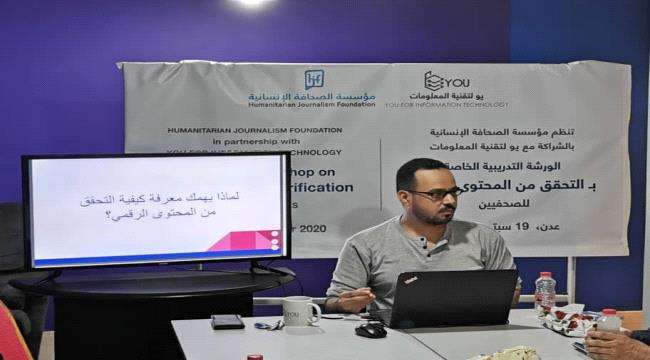 نظمت "مؤسسة الصحافة الإنسانية HJF" بالشراكة مع "يو لتقنية المعلومات YOU IT" اليوم السبت 19 سبتمبر الجاري بمدينة عدن ورشة عمل نوعية حول "ادوات التحقق من المحتوى الرقمي" ضمن برنامج بناء القدارت وتطوير المهارات في الصحافة الرقمية والإعلام الجديد.
