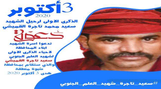 دعاء القيادي في المقاومة الجنوبية وعضو الجمعية الوطنية الجنوبية خالد منصور السليماني أبناء محافظة شبوة إلى المشاركة في الذكرى الأولى لاستشهاد سعيد محمد تاجرة القميشي المزمع إقامتها يوم 3/ اكتوبر القادم. وقال السليماني في رسالة نشرها عبر وسائل التواصل الاجتماعي: نناشد ابناء شبوة الاحرار التحضير والتجهيز للزحف إلى منطقة هدى مديرية حبان محافظة شبوة والمشاركه الفعالة في أحياء الذكرى الاولى لاستشهاد شهيد العلم الجنوبي الشهيد البطل سعيد تاجرة القميشي رحمه الله عليه وكل شهدا الجنوب. خالد منصور السليماني عضو الجمعية الوطنية الجنوبية