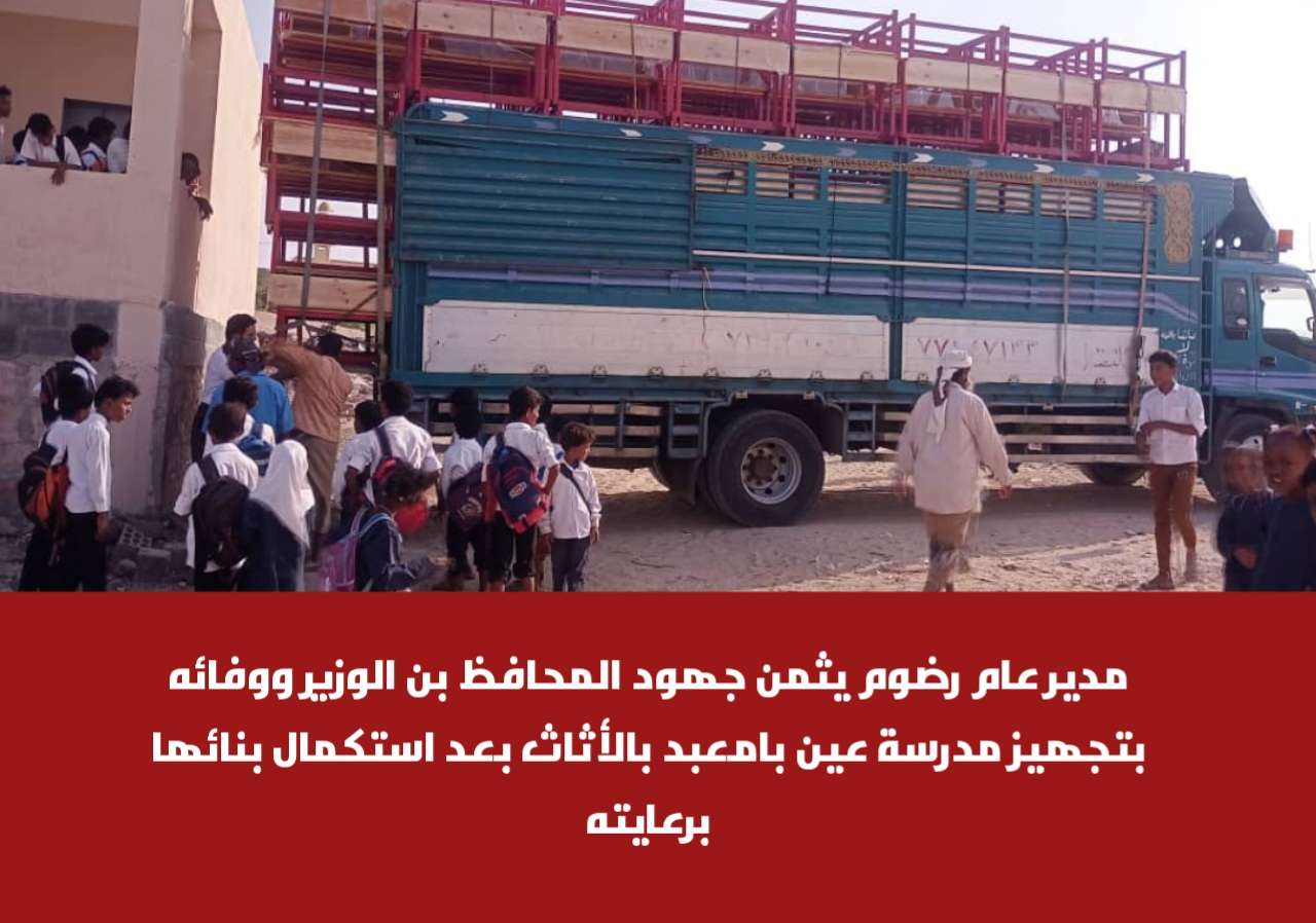 مدير عام رضوم يثمن جهود المحافظ بن الوزير ووفائه بتجهيز مدرسة عين بامعبد بالأثاث بعد استكمال بنائها برعايته