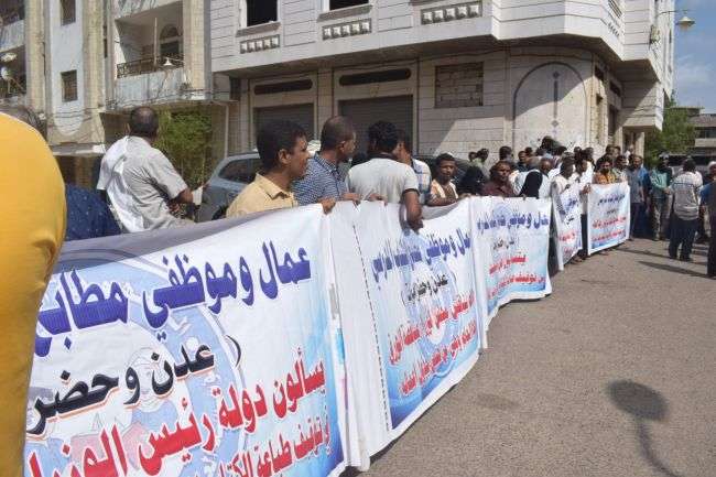 عمال مطابع الكتاب المدرسي في عدن ينظمون وقفة إحتجاجية أمام مبنى المحافظة للمطالبة بمرتباتهم وتشغيل المؤسسة