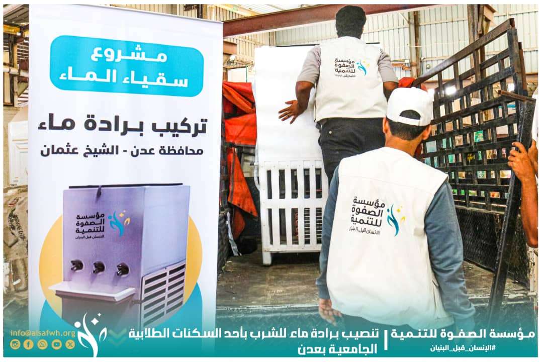 نفّذت مؤسسة الصفوة للتنمية، عملًا خيريًا جديدًا ضمن مشروع سقيا الماء، تمثّل في تركيب برادة مياه شرب بأحد السكنات الطلابية الجامعية في مديرية الشيخ عثمان بالعاصمة عدن، وذلك في إطار جهودها الإنسانية المستمرة لتوفير مصادر مياه نظيفة ومبردة في الأماكن ذات الحاجة. ويهدف هذا المشروع إلى تخفيف معاناة الطلبة والمقيمين في السكن الجامعي من صعوبة الحصول على مياه شرب باردة ونقية، خاصة في ظل ارتفاع درجات الحرارة ونقص الخدمات الأساسية، وذلك في إطار تعزيز العمل الإنساني والخيري في المجتمع.