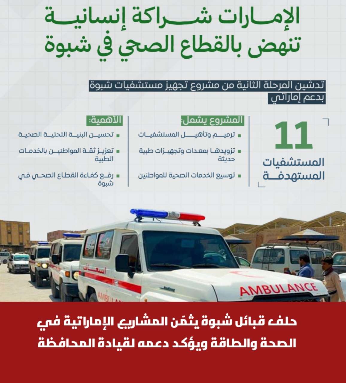 حلف قبائل شبوة يثمّن المشاريع الإماراتية في الصحة والطاقة ويؤكد دعمه لقيادة المحافظة