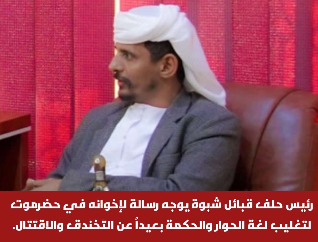رئيس حلف قبائل شبوة يوجه رسالة لإخوانه في حضرموت لتغليب لغة الحوار والحكمة بعيداً عن التخندق والاقتتال