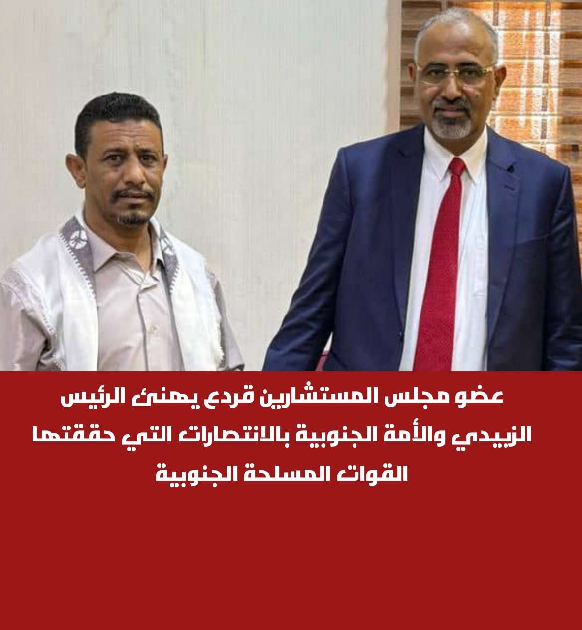 عضو مجلس المستشارين قردع يهنئ الرئيس الزبيدي والأمة الجنوبية بالانتصارات التي حققتها القوات المسلحة الجنوبية