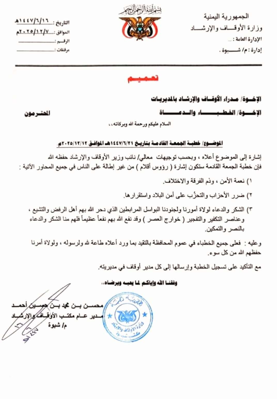 أصدر مكتب الأوقاف والإرشاد بمحافظة شبوة توجيهًا رسميًا لخطباء المساجد بشأن موضوع خطبة الجمعة القادمة بتاريخ 21 جمادى الآخرة 1447هـ الموافق 12 ديسمبر 2025م، وذلك مواكبة لحرص السلطة المحلية بقيادة المحافظ عوض محمد بن الوزير على ترسيخ حالة الأمن والاستقرار وتعزيز الوعي المجتمعي بما تحقق من منجزات. وأوضح مدير عام مكتب الأوقاف والإرشاد، محسن بن محمد حسين أحمد، أن هذا التوجيه يأتي منسجمًا مع توجهات القيادة المحلية، ومواكبًا لمسؤوليات الخطباء في المرحلة الراهنة، بحيث تتضمن الخطبة إشارة مختصرة وواضحة دون إطالة على المصلين، وتشمل المحاور الآتية: 1. التذكير بنعمة الأمن وأثرها في استقرار المجتمع، مع التحذير من الفرقة والاختلاف وكل ما يمزق وحدة الصف. 2. بيان مخاطر الأحزاب والتحزب على أمن البلاد واستقرارها، وما تسببه من تشويش وانقسامات تهدد السلم الاجتماعي. 3. إبداء الشكر والدعاء لولاة الأمر ولأبطال القوات المسلحة والأمن الذين مكّن الله بهم من دحر دعاة الفتنة ومروّجي الفكر الهدّام والعناصر التكفيرية (خوارج العصر)، تقديرًا لتضحياتهم وجهودهم المباركة في حماية الوطن. وأكد التوجيه أهمية تعزيز طاعة الله ورسوله، وترسيخ طاعة ولاة الأمر – حفظهم الله – باعتبارها أساسًا لاستمرار نعمة الأمن، وضمانًا للحفاظ على المكاسب التي تنعم بها المحافظة في هذه المرحلة. ويأتي هذا التحرك ليجدد التأكيد على الدور الحيوي للمنابر الدينية في تعزيز الوعي المجتمعي وترسيخ الاستقرار وإسناد جهود السلطة المحلية في حماية السلم والنسيج الاجتماعي بمحافظة شبوة.
