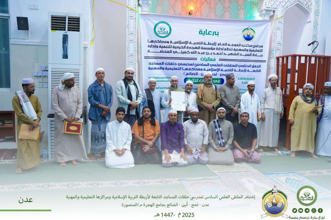 اختُتمت فعاليات الملتقى العلمي السادس لمدرسي حلقات المساجد التابعة لأربطة التربية الإسلامية ومراكزها التعليمية والمهنية، فالحمد لله الذي بنعمته تتم الصالحات. وقد أُقيم حفل الختام مساء يوم الأربعاء 11 رجب 1447هـ الموافق 31 ديسمبر 2025م، في جامع الهجرة بمديرية المنصورة، تحت رعاية مكتب الموجّه العام لأربطة التربية الإسلامية ومراكزها التعليمية والمهنية. استُهل الحفل بتلاوة عطرة من آيات الذكر الحكيم، تلاها الأستاذ الحافظ محمد فتحي، فأضفت على المكان سكينةً ووقارًا، أعقبتها الكلمة الافتتاحية التي ألقاها الأستاذ عبدالرحمن المحضار رئيس مؤسسة الهجرة الخيرية للتنمية، حيث رحّب فيها بالسادة الأفاضل من العلماء والمشايخ والمدرسين والحاضرين جميعًا، مؤكدًا أهمية هذه الملتقيات والدورات العلمية والتدريبية في بناء المدرس وتأهيله علميًا ومهاريًا، وما تحمله من أثرٍ بالغ في تعزيز مفاهيم الاكتفاء الذاتي وخدمة المجتمع. وتوالت بعد ذلك كلمات المشايخ والعلماء، ثم كلمات المشاركين الذين عبّروا عن تجاربهم العلمية والعملية في الدورات التدريبية المصاحبة للملتقى؛ حيث تحدّث الأستاذ أديب العشالي من جامع الخيرات بمنطقة الممدارة – عدن عن دورة التمديدات الكهربائية، مستعرضًا أبرز المحاور التي تلقوها وما تحمله من فائدة عملية ملموسة. كما تحدّث الدكتور ياسر الدلالي من الزاوية الأحمدية بالشيخ عثمان – عدن عن دورة الزراعة المنزلية، مبيّنًا ما اكتسبه المشاركون من مهارات ومعارف تسهم في تحسين سبل العيش وتعزيز الاعتماد على الذات. وفي محور الكفايات المطلوب توفرها في مدرس الحلقات، ألقى الأستاذ داؤود كداف من مسجد حصن شداد بمنطقة الكود – محافظة أبين كلمةً أوضح فيها أهمية هذا المحور في صقل شخصية المدرس علميًا وتربويًا، ورفع مستوى أدائه داخل الحلقات القرآنية. كما تناول الأستاذ إبراهيم ماهر غازي من مسجد الإحسان بكريتر بالعاصمة عدن دورة إدارة الحلقات القرآنية المتكاملة، مبيّنًا كيف أسهمت هذه الدورة في تمكين المشاركين من إنشاء حلقات قرآنية بأسلوبٍ مدروس وممنهج ومنظّم. أما الشيخ هارون نابت من مسجد الحجازي بمنطقة الخداد – محافظة لحج، فقد تحدّث عن دورة الإلحاد والقضايا الخلافية، مشيرًا إلى أهميتها البالغة في هذا العصر الذي كثرت فيه الشبهات والأفكار المنحرفة، ودورها المحوري في تأهيل مدرس الحلقات للرد العلمي الرصين وحماية النشء. وتخللت فقرات الحفل الأناشيد الهادفة والقصائد المؤثرة التي أضفت على المناسبة جمالًا وروحانية، وعكست ما يحمله المشاركون من شغفٍ بالعلم ورسالة التعليم. وفي ختام الحفل، تم تكريم جميع الطلاب المشاركين، الذين قدموا من أكثر من ثلاثين مسجدًا وجامعًا ورباطًا وزاوية، حيث بلغ عدد المشاركين أكثر من 140 مشاركًا من عدة محافظات، شملت عدن، ولحج، وأبين، والضالع، في لوحةٍ جامعة جسّدت وحدة الهدف وتكامل الرسالة استمرت الدورات شهراً كاملاً . وكذلك تم تكريم الطلاب المشاركين في الملتقى العلمي الأول لطلاب أربطة التربية الإسلامية ومراكزها التعليمية والمهنية بالعاصمة عدن حيث بلغ عدد الطلاب المشاركين ١٢ طالباً من رباط الشهيد أحمد كعيتي المحضار بالمنصورة ورباط الحبيب علي المشهور بالممدارة . وقد تميّز حفل الختام بحسن التقديم والتنظيم، حيث تولّى الأستاذ علي الضمبري تقديم فقرات الحفل بأسلوبه الشيق والجميل، فجمع بين رصانة العبارة وعذوبة الأداء، وأدار فقرات الأمسية بسلاسة واقتدار، مما أضفى على الحفل رونقًا خاصًا وتفاعلًا لافتًا من الحاضرين. وفي الختام، تتقدّم مؤسسة الهجرة الخيرية للتنمية بخالص الشكر وعظيم الامتنان لكل من أسهم في إنجاح هذا الملتقى المبارك؛ من رعاةٍ ومنظمين ومشايخ ومدرسين ومشاركين، سائلين الله تعالى أن يجعل ذلك في موازين حسناتهم، وأن يبارك في الجهود، ويكتب القبول والتوفيق، والحمد لله رب العالمين.