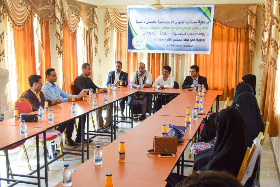 برعاية مكتب الشؤون الاجتماعية والعمل م/شبوة؛ اقيم حفل اشهار مؤسسة معالي للتنمية وورشة عمل بعنوان "العمل التطوعي ودورة في خلق مجتمع اكثر مسؤولية" اليوم الخميس الموافق 15 من اكتوبر ، بحضور السلطة المحلية وقد حضر الحفل كلا ً:- مدير عام مكتب الشؤون الاجتماعية والعمل شبوة الاستاذ/ علي احمد صالح عمير ومدير عام مكتب الاعلام شبوة الاستاذ/ عبدالله بارحمة ومدير عام صندوق النظافة والتحسين شبوة الاستاذ/ محمد فضل الحامد ونائب مدير مكتب الشؤون الاجتماعية والعمل الاستاذ/ صالح باوهال ورئيس منظمة شباب شبوة الاستاذ/ احمد خيران والمهندس/ سالم محمد العتيقي ورئيس مؤسسة رؤية للتنمية والتدريب الاستاذ / بشار شريفان الخليفي واعضاء مؤسسة معالي للتنمية.