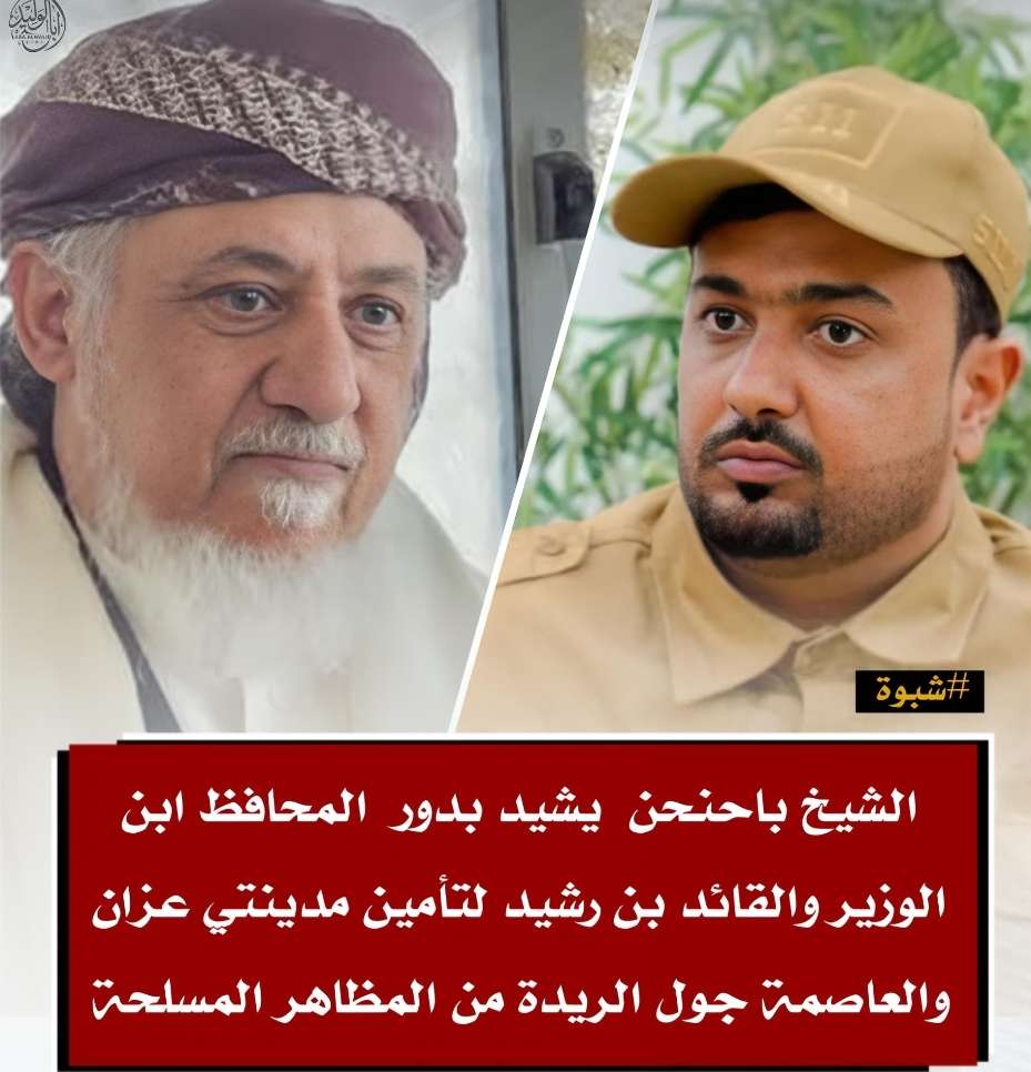 الشيخ باحنحن يشيد بدور المحافظ ابن الوزير والقائد بن رشيد لتأمين مدينتي عزان والعاصمة جول الريدة من المظاهر المسلحة