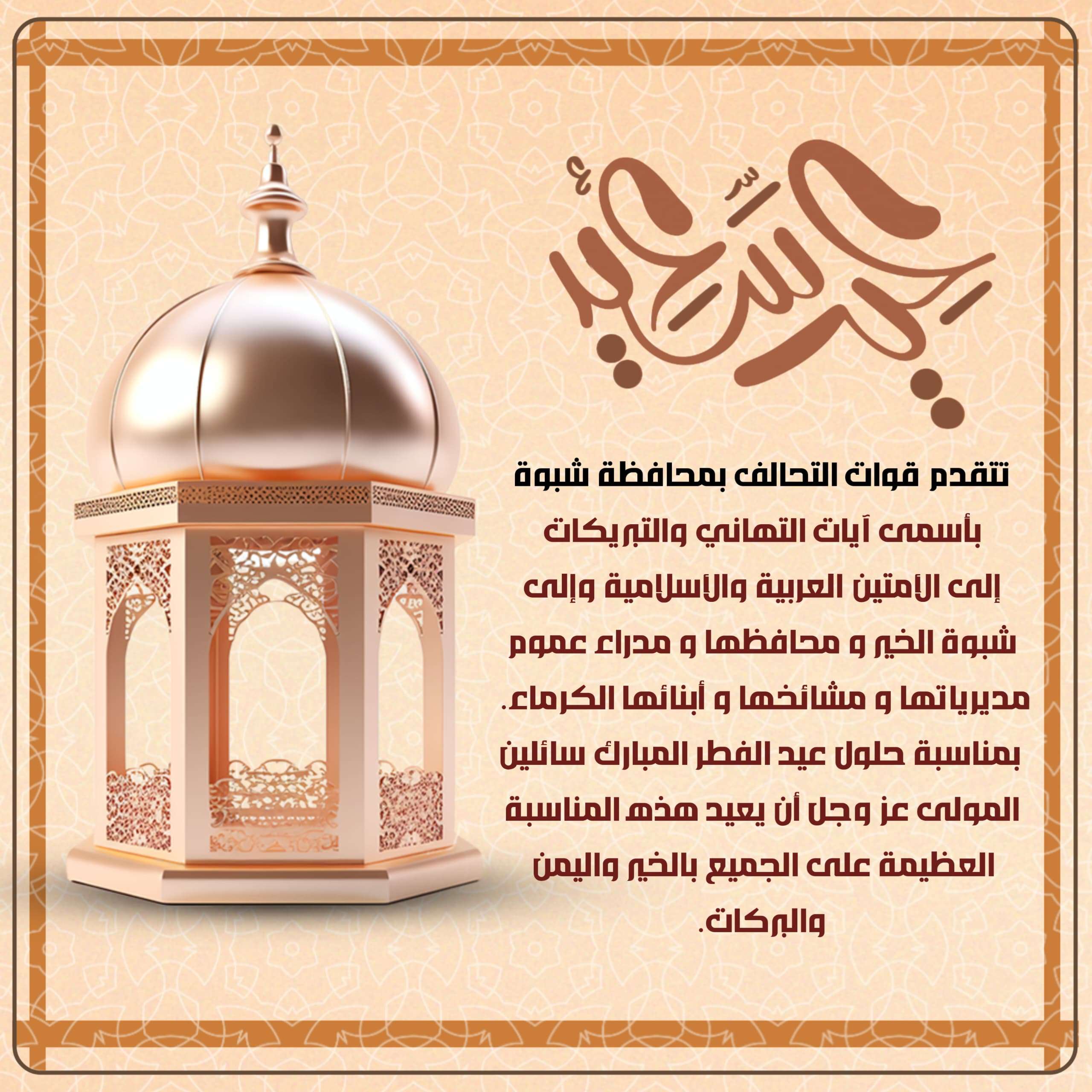 قيادة قوات التحالف بمحافظة شبوة تهنئ السلطة المحلية وأبناء المحافظة بمناسبة عيد الفطر المبارك