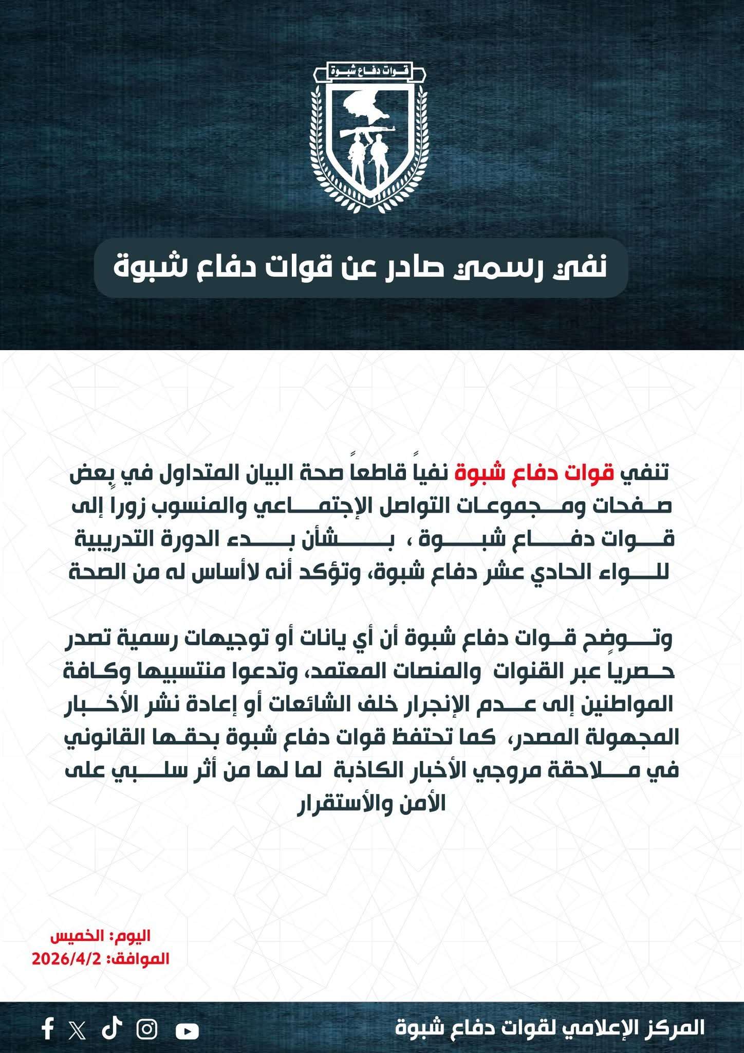 نفت قيادة قوات دفاع شبوة، نفياً قاطعاً، صحة البيان المتداول عبر بعض صفحات ومجموعات التواصل الاجتماعي، والذي نُسب زوراً للقوات بشأن بدء دورة تدريبية للواء الحادي عشر، مؤكدة أن تلك المعلومات لا أساس لها من الصحة. وأوضحت القوات في بلاغ رسمي، أن كافة البيانات والتوجيهات تصدر حصرياً عبر القنوات والمنصات المعتمدة والناطقة باسمها، داعية منتسبيها وكافة المواطنين إلى توخي الحذر، وعدم الانجرار خلف الشائعات أو المساهمة في نشر الأخبار مجهولة المصدر. كما شددت قوات دفاع شبوة على أنها تحتفظ بحقها القانوني الكامل في ملاحقة مروجي هذه الأخبار الكاذبة، مشيرة إلى خطورة هذه الادعاءات وتأثيرها السلبي على حالة الأمن والاستقرار التي تشهدها المحافظة.