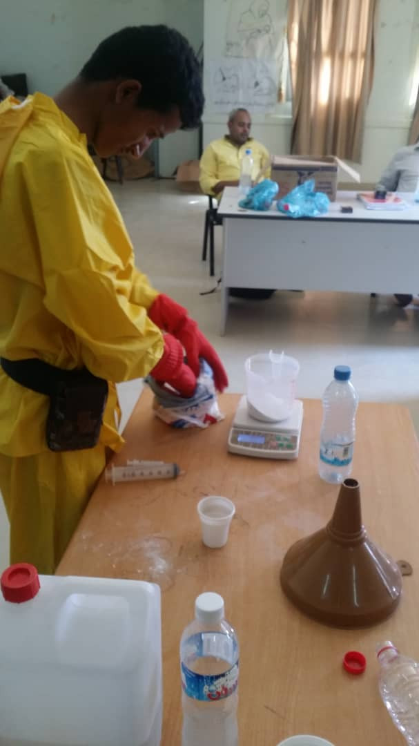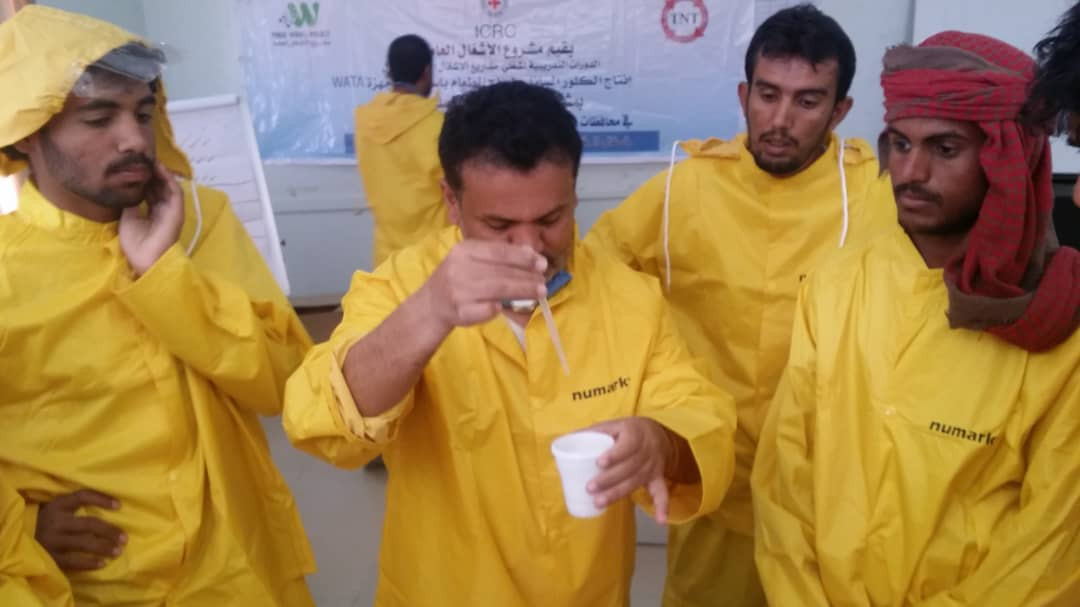 . أختتمت بنجاح منقطع النظير اليوم في عاصمة محافظة شبوة عتق فعاليات الدورة التدريبية لإنتاج الكلور السائل من ملح الطعام باستخدام أجهزة (wata) واضافته الى مياه الشرب والتي ينفذها مشروع الأشغال العامة بالتعاون مع الصليب الأحمر الدولي والتي استهدفت عدد من مشغلي مشاريع المياه في محافظتي شبوة ومارب. وفي ختام فعاليات الدورة التدريبية أشار المهندس / محسن سعيد حيمد مدير مشروع الأشغال العامة المنطقة الفرعية مأرب شبوة ان الهدف الأساسي من الدورة هو تدريب المشاركين على العمل على أجهزة (wata) والتي تقوم بانتاج الكلور السائل من ملح الطعام والذي يسهل الحصول عليه في كل الظروف بعكس الكلور المصنع خارجيا.وكذلك تدريبهم على كيفية استخدامة لمعالجة مياه الشرب بصورة امنة. وأكدالمهندس / محسن حيمد ان مشروع الاشغال العامة قد قام بتنفيذ عدد من مشاريع مياه الشرب في عدد من قرى محافظتي شبوة ومارب اسوة بغيرها من المحافظات..وانه تم بناء وتجهيز عدد من الغرف الخاصة بتجهيز الكلور وقام الصليب الأحمر الدولي بدوره بتوفير الاجهزة الخاصة بانتاج الكلور السائل من ملح الطعام وسوف يتم توزيعها قريبا على المشاريع بعد تدريب العاملين في المشاريع عليها. فيما أوضح المهندس / محمد علي بورجي والذي قام بالتدريب المكثف للمستهدفين أنه تم تدريب المتدربين على نوعين من الاجهزة وهي (واتا ستاندرد)والذي يستطيع انتاج (2) لتر من الكلور السائل خلال ساعتين ونصف والذي يستخدم عادة في المشاريع الصغيرة. وجهاز (واتا بلس)ويستطيع انتاج (15) لتر من الكلور السائل خلال (4) ساعات.وهذه الأجهزة غير متوفرة بالسوق المحلية وانما تم توريدها خصيصا للصليب الأحمر الدولي والذي بدوره سلمها لمشروع الأشغال العامة.