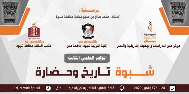 تشهد عتق، عاصمة محافظة شبوة، بعد غد الاثنين انعقاد أعمال المؤتمر العلمي الثالث لمركز عدن للدراسات والبحوث التاريخية والنشر،تحت شعار "شبوة تاريخ وحضارة" بالتعاون مع كلية التربية ومكتب الثقافة بالمحافظة.