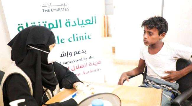 وسيرت الهيئة عيادات طبية متنقلة إلى مناطق نائية في محافظة حضرموت ضمن مشروع العيادة المتنقلة التي تدعمها دولة الإمارات لإيصال الرعاية الصحية إلى سكان القرى النائية التي لا تتوفر فيها المستشفيات او الكادر الطبي.