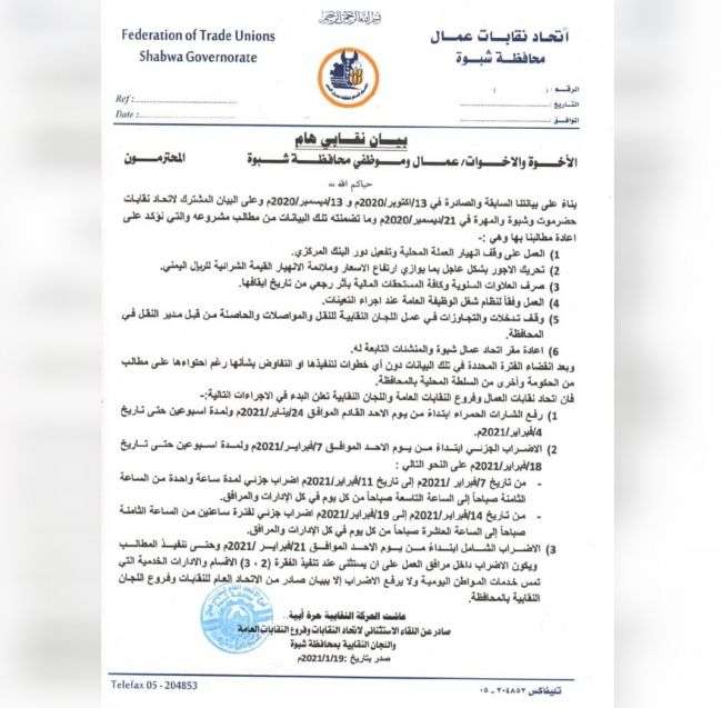 صادر عن اللقاء الاسـتثنائي لاتحاد النقابات وفروع النقابات العامة واللجان النقابية بمحافظة شبوة في 19 يناير 2021م