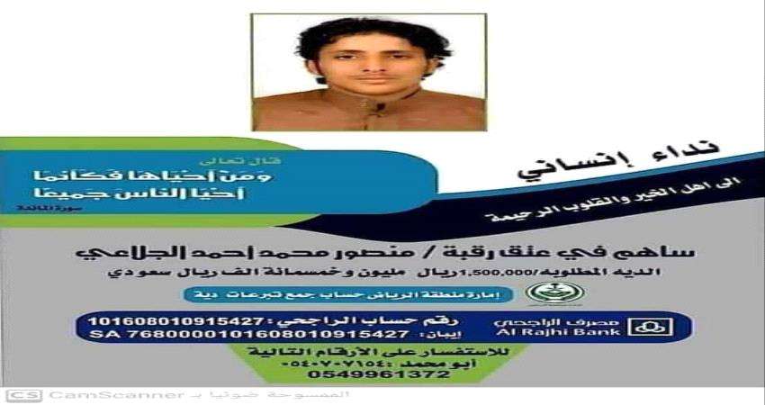 لقي نداء عتق رقبة يمني من حكم قضائي في المملكة العربية السعودية تفاعل كبير قبل إنقضاء المدة المحددة بإعدامه او دفع دية المجني عليه مصري الجنسية. ونشر نشطاء وصحفيون عن المواطن اليمني منصور محمد احمد الجلاعي من محافظة ابين حسب ما يتداول داعين اهل الخير والبر والقلوب الى إعانته على دفع الدية المطلوبة وقدرها مليون وخمسمائة الف ريال سعودي لعتق رقبته من إرتكابه قتل غير عمد ولم يتبق من فترة تنفيذ الا أيام قليلة. وتبنى الصحفيون وناشطون بنشر حساب التبرع الى مصرف الراجحي بحسب الصورة المرفقة. وتبرعت يمنية تقيم في الامارات قبل قليل بمبلغ قدره خمسين الف درهم إماراتي بالاضافة الى تبرعات اخرى محدودة لم تبلغ مستوى الدية بعد.