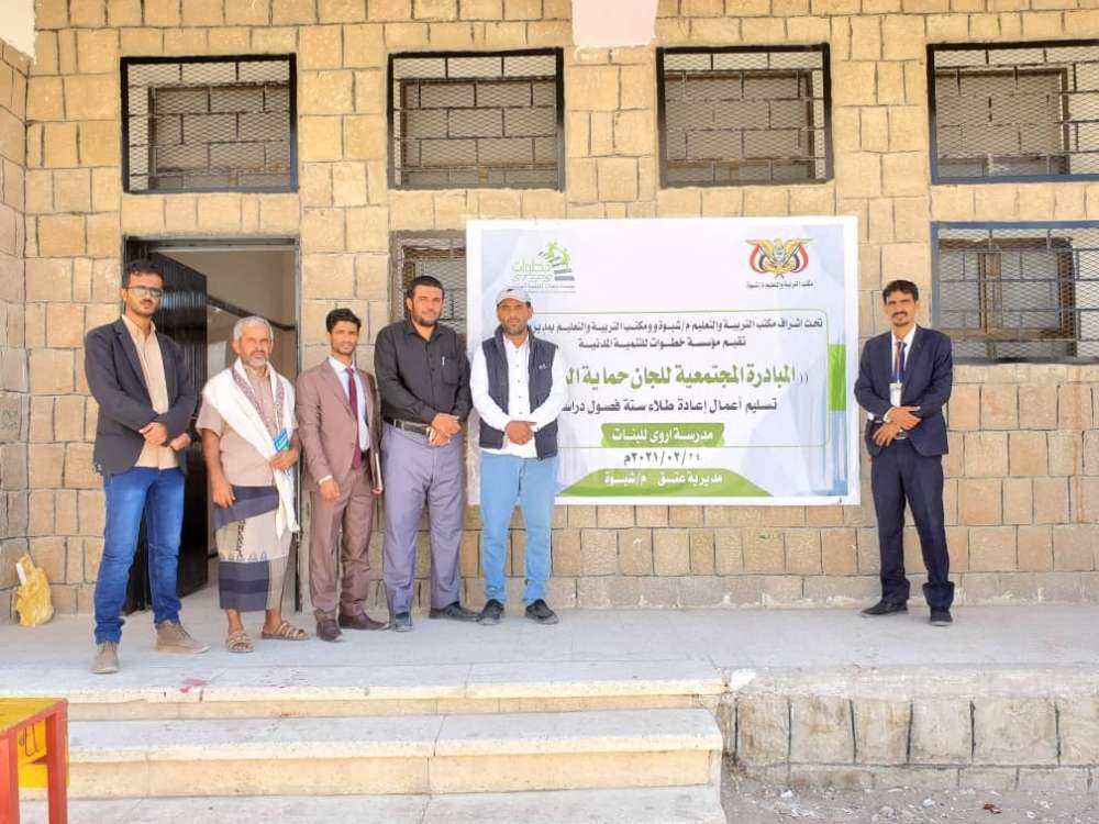 قامت مؤسسة خطوات للتنمية بتنفيذ مبادرة مجتمعية ضمن مشروع " حماية الطفل " بالشراكة مع منظمة DRC وبتمويل من اليونيسف، حيث قامت المؤسسة بتنفيذ هذه المبادرة مع اللجان المجتمعية لحماية الطفل في مدينة عتق. وشملت المبادرة التي نفذتها المؤسسة بالتنسيق مع مكتب التربية والتعليم بمديرية عتق طلاء ستة فصول دراسية بمدرسة اروئ للبنات بمدينة عتق، بهدف تحسين البيئة المدرسية والمساهمة في خدمة المجتمع. وقال مدير التنفيذي لمؤسسة خطوات، ريدان لعور " أن تنفيذ المؤسسة لهذه المبادرة يندرج في إطار أنشطتها في حماية الطفل، وتهدف هذه المبادرة الى تحسين البيئة التعليمية وتفعيل المشاركة المجتمعية وتشجيع أفراد المجتمع على تنفيذ مثل هذه المبادرات، كما عبر عن بالغ شكره وامتنانه لمكتب التربية والتعليم بالمديرية ممثلا بالأستاذ محمد عوض عامر على تعاونه الكبير في انجاح هذه المبادرة". من جانبه أشاد مدير مكتب التربية والتعليم بمديرية عتق، الأستاذ محمد عوض عامر "بالمبادرة المجتمعية التي نفذتها مؤسسة خطوات، كما اثنى على دور مثل هذه المبادرات في خدمة المجتمع، مؤكدا على أهمية الشراكة بين مكتب التربية والتعليم والمنظمات المحلية والمجتمع المحلي لخدمة قطاع التعليم". وحث عامر، خلال تسليم أعمال المبادرة مؤسسة خطوات على اقامة مثل هذه المبادرات التي تساهم في تحسين البيئة المدرسية للطلبة والتي تعد من العناصر الأساسية في العملية التعليمية وتنعكس بصورة ايجابية على المجتمع.