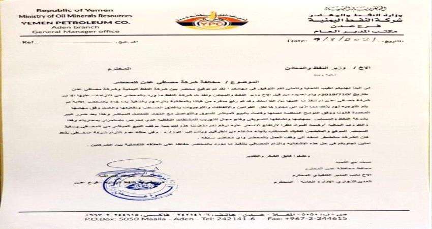 أدانت شركة النفط بعدن تجاوزات شركة مصافي عدن ومخالفتها للقوانين المنظمة للعمل وكذا المحاضر المتفق عليها مؤخرا. جاء ذلك في مذكرة موجهة من مدير عام شركة النفط بعدن الأستاذة انتصار العراشة إلى وزير النفط والمعادن للمطالبة بوقف تجاوزات شركة مصافي عدن والزامها بالمحضر الموقع في 10/7/2019 بين المصافي وشركة النفط بعدن لتنظيم العمل. واكدت العراشة أن المصافي قامت ببيع المشتقات النفطية بشكل مباشر للسوق المحلية مخالفة بذلك القوانين والمحاضر المتفق عليها. وأشارت إلى أن ما قامت به المصافي يلحق الضرر بشركة النفط بعدن ومهامها ونشاطها التسويقي ويفتح المجال لتهريب المشتقات النفطية الذي تحرص الشركة باستمرار على محاربته والحد منه. وهددت بوقف العمل بالمحضر المذكور في حال لم تلتزم المصافي بما جاء فيه مطالبة وزير النفط والمعادن بإيقاف البيع المباشر المشتقات النفطية من قبل مصافي عدن.