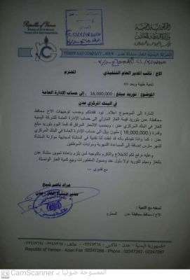 وجه مدير منشأة الغاز فرع عدن مراد ناصر شيخ مذكرة الى نائب المدير العام التنفيذي تفيد بتوريد مبلغ ١٦ مليون الى حساب الإدارة العامة لشركة الغاز اليمنية في البنك المركزي بالعاصمة المؤقتة عدن .