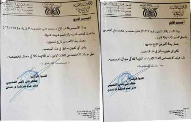 وقضى الأمر الإداري الأول بتكليف النقيب عدنان محمد بن محمد علي المحرمي بالعمل مديراً لقسم شرطة كابوتا والغاء أي تكليف سابق بهذا المنصب.