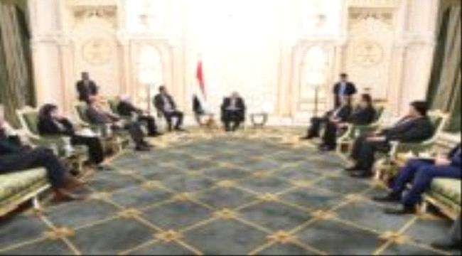 وخلال اللقاء الذي حضره نائب الرئيس الفريق الركن علي محسن صالح ورئيس الوزراء الدكتور معين عبدالملك، أكد فخامته حرص الشرعية على إحلال السلام المستدام وفقا للمرجعيات الثلاث وبما يحفظ وحدة وامن واستقرار اليمن.