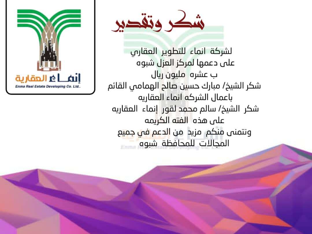 لشركة انماء للتطوير العقاري على دعمها لمركز العزل شبوه ب عشره مليون ريال شكر الشيخ/ مبارك حسين صالح الهمامي القائم باعمال الشركه انماء العقاريه شكر الشيخ/ سالم محمد لقور إنماء العقاريه على هذه الفته الكريمه ونتمنى منكم مزيد من الدعم في جميع المجالات للمحافظة شبوه