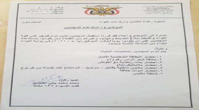 كشفت وثيقة رسمية عن عمليات تجنيد قامت بها الشرعية اليمنية لعناصر حوثية بالتنسيق مع قيادات حوثية وإرسالهم إلى أحد الألوية الشمالية في محافظة المهرة الجنوبية. وفي وثيقة رسمية صادرة عن قيادة اللواء 137مشاة، استدعت فيها المجندين الذين تم تجنيدهم بالتنسيق مع قيادات حوثية وجميعهم ينتمون لمناطق تقع تحت سيطرة المليشيات الحوثية. وقالت مصادر عسكرية إنه تم تجنيد العشرات من أبناء صنعاء وذمار وعمران بتنسيق بين قائد اللواء العميد ركن محمد محمد يحيى القاضي قائد اللواء 137 مشاة وقيادات حوثية وبتواطؤ من قيادات إخوانية، وضمهم ضمن قوة اللواء في المهرة لتنفيذ مخطط حوثي في المحافظة الجنوبية. وقالت مصادر " إن هذا اللواء متخصص منذ احتلال الجنوب في تهريب الأسلحة والمخدرات وقادته يملكون المليارات، كما قام بعمليات تهريب أسلحة لمليشيات الحوثي". الجدير بالذكر أن قائد اللواء هو صهر الرئيس السابق علي عبدالله صالح.