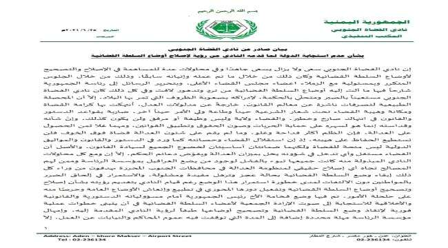 إن نادي القضاة الجنوبي سعى ولا يزال يسعى جاهدًا وفي محاولات عدة للمساهمة في الإصلاح والتصحيح لأوضاع السلطة القضائية وكان ذلك من خلال ما تم عمله وإتيانه سابقًا، وذلك من خلال الجلوس المتكرر وبمسئولية مع الزملاء اعضاء مجلس القضاء الأعلى، وبتحرير الرسائل إلى رئاسة الجمهورية شارحاً فيها ما آلت إليه أوضاع السلطة القضائية من تردٍ وتدهور لافت وفي كل ذلك كان نادي القضاة الجنوبي مستعيناً بالصبر ومتحلّي بالحكمة، لإدراكه بصعوبة الظروف التي تمر بها البلاد، إلاّ أن المحصلة الطبيعية لتصرفات ناشزة عن معالم القانون، خارجةً عن مدلولات العدل، اُنتهكت بها كرامة القضاة ومكانة وهيبة القضاء تحت شعار الشرعية حيناً وطاعة ولي الأمر حيناً آخر، ضاربة بقواعد الدستور والقانون في انتهاك صارخ وخطير، والقضاء ولاية وليس وظيفة أو مرفق ولن يكون كذلك، وإنّ شأنه وقداسته إنما هو لسهره على حماية الحريات وصون الحقوق وتطبيق القوانين، ومهما غلا ثمن الحصول على العدالة، فإن الظلم أكثر فداحة وغلو، وما لم يقم على شئون العدالة قضاة فوق الخوف فلن نستطيع الحفاظ على هيبته، إذ إن استقلال القضاء وحصانته كما ورد في الدستور والقانون والمواثيق الدولية ليس منحة للقضاة ولكنهما ضمانتان أساسيتان لخضوع الجميع لسيادة القانون، والأصل أن القضاء مستقل وأي تدخل في شؤونه يخل بميزان العدالة ويقوّض دعائم الحكم، إلاّ إن ومع كل محاولات النادي المبذولة منه كانت جميعها تبوء بالفشل لوجود من يضع العراقيل بمؤسسة الرئاسة وممن لهم المصالح تجاه أي إصلاح حقيقي لمنظومة العدالة في محافظات الجنوب المحررة يهدفون من وراء كل ذلك إبقاء وضع السلطة القضائية بحالة عجز وترهل مقيدة ومشلولة، والاستمرار في إلحاق الضرر بالمواطنين دون الالتفات لمدى خطورة استمرار هذا الوضع رغم قيام النادي بتقديم رؤيته بشأن إصلاح وتصحيح أوضاع السلطة القضائية وتفعيل دورها المحوري في تطبيع وإنعاش الأوضاع العامة وحرصًا منه على حلحلة الأمور، تم فيها وضع فخامة الأخ رئيس الجمهورية أمام مسؤولياته الدستورية والقانونية والأخلاقية للاستجابة إلى صوت الإرادة الجمعية لأعضاء السلطة القضائية في أن يتبنى خطوات عملية فورية لإنقاذ وضع السلطة القضائية وتصحيح أوضاعها طبقاً لرؤية النادي المقدمة إليه، وإمهال مؤسسة الرئاسة مهلة محددة إضافة إلى المدة التي توقفت فيه عموم المحاكم والنيابات عن العمل، إلاّ أن مؤسسة الرئاسة ظلت متجاهلة وضع السلطة القضائية المتدهور، وغير آبهة لوضع البلاد ومصالح المواطنين بسبب التجاذبات الحزبية وأصحاب النفوذ في إطارها المتماهية مع تلك التجاذبات الحزبية التي تعمل في المحافظة على حصصها بمجلس القضاء الأعلى وتسييره وفق أجنداتها الحزبية والخاصة.