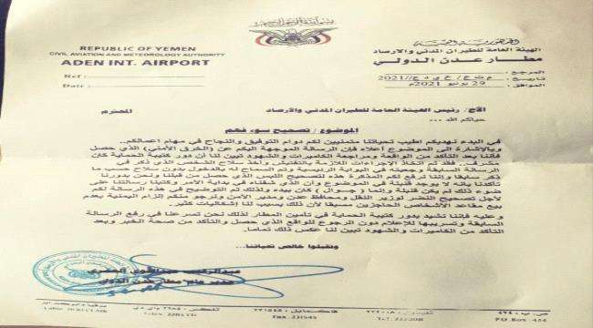 وجة مدير عام مطار عدن عبد الرقيب عبدالقوي العمري مذكرة عنونها (تصحيح سوء فهم) واضح مدير المطار من خلال المذاكره الالتباس الذي حصل في المذكرة السابقة حول الخرق الأمني بادخال قنبلة الى صالة المطار الذي اتهم فيه يوسف مرافق اللواء شلال. وأكد مدير المطار انه بعد مراجعه الكاميرات والشهود تبين ان دور كتيبة الحماية مشرف وقد تم اتخاذ الإجراءات اللازمة بالتفتيش للشخص الذي ذكر في الرسالة السابقة يوسف. وحول ماورد في المذكرة السابقة انها قنبلة قال مدير المطار : تأكدنا بانه لا يوجد قنبلة وانما جوال كان بيده لذا وجب التوضيح.