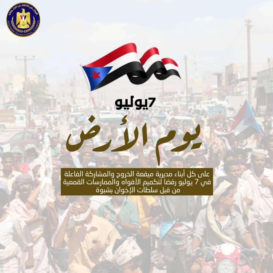 * الى أبناء مديرية ميفعة بكل شرائحهم الإجتماعية والسياسية والعسكرية والثقافية والرياضية. تدعوكم اللجنة التحضيرية للفعالية الجماهيرية بمديرية ميفعة محافظة شبوة للاحتشاد والمشاركة الفاعلة صباح يوم الاربعاء 7 / 7 / 2021 في التظاهرة الجماهيرية الشعبية بمنطقة صعيد باقادر، وذلك لتعبير عن رفض ابناء المديرية للهيمنة الإخوانية وما تنفذه هذه المليشيات من انتهاكات وجرائم واختطافات وحصار وحملات عدائية لأبناء المديرية والمحافظة بشكل عام. ومن هذا المنطلق ندعوا كافة ابناء المديرية بكل المكونات والشرائح الاجتماعية والسياسية للحضور والمشاركة في الفعالية للتعبير السلمي ورفض تلك التصرفات والانتهاكات التي تقوم بها سلطة شبوة الإخوانية بحق ابناء المديرية والمحافظة وعابري السبيل. اللجنة التحضيرية لفعالية 7 يوليو وبالتنسيق مع المراكز تقوم بكافة الترتيبات والتجهيزات لانجاح الفعالية التي ستقام في منطقة الصعيد صباح يوم الأربعاء 7 يوليو، نرجو من الجميع التفاعل والحضور والمشاركة لما لهذه الفعالية من أهمية بالغة في تاريخ شبوة والجنوب وشكراً. الرحمة والمغفرة لشهداء شبوة والجنوب الأبرار الشفاء للجرحى الحرية للأسرى والمعتقلين صادر عن : *اللجنة التحضيرية للفعالية الجماهيرية بمديرية ميفعة محافظة شبوة الأحد 4 يوليو 2021*