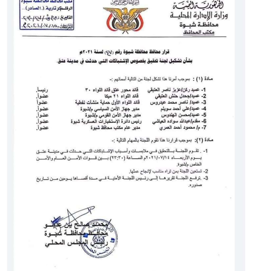 أصدر محافظ محافظة شبوة محمد صالح بن عديو ، قرارا قضى بتشكيل لجنة للتحقيق في حادثة الاشتباكات المسلحة التي حدثت مساء يوم أمس بين قوات أمنية في مدينة عتق، عاصمة المحافظة. وبحسب مذكرة القرار الصادر عنه، فقد كلف المحافظ "بن عديو" قائد محور عتق برئاسة لجنة التحقيق، وضمت في عضويتها كل من " قائدي اللوائين 21 ميكا والاول حماية منشآت نفطية، ومديري الامن السياسي والامن القومي، ورئيس الاستخبارات العسكرية بالمحافظة، ومدير مكتب المحافظ". ووجه المحافظ في مذكرة القرار، اللجنة بالتحقيق في ملابسات واسباب الاشتباكات التي وقعت مساء يوم امس في مدينة عتق عاصمة المحافظة، بين قوات من الامن العام والامن الخاص. واعطى المحافظ اللجنة الحق في الاستعانة بمن تراه مناسبا لاجراء التحقيق. وطلب " بن عديو" من اللجنة الرفع بنتائج التحقيق اليه خلال مدة أقصاها يومان.