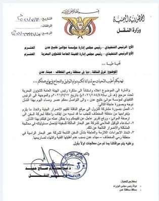 3- أتخاذ الاجراءات اللأزمة والعاجلة بشأن السفن التابعة لشركة عبر البحار الراسية في منطقة رمي الخطاف - ميناء عدن بسبب عدم اهليتها الفنية وانتهاء تصاريحها.