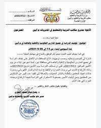 أقرت السلطات المحلية في محافظة أبين تعليق الدراسة في مدارس محافظة أبين لمدة أسبوعين تبدأ من يوم الاثنين نظرًا لموجة الحر الشديدة التي تجتاح المحافظة هذه الأيام. وسبق أن اتخذت السلطات في عدن خطوات مماثلة لذات الأسباب. وتسببت موجة الحر، بأبين في وفاة المعلمة، نضال العاقل، فيما أمر المحافظ بتغيير اسم المدرسة باسم الفقيدة التي سقطت مغشيًا عليها وهي تزاول مهنة التدريس في المدرسة.