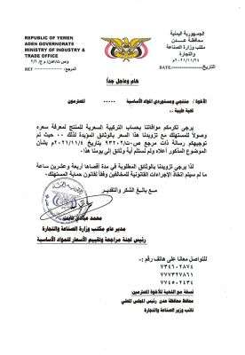 وشدد مدير عام الصناعة والتجارة بعدن بتزويد المكتب بالوثائق المطلوبة في مدة أقصاها ٢٤ ساعة من تاريخ التعميم مالم سيتم اتخاذ الإجراءات القانونية للمخالفين وفقا لقانون حماية المستهلك.