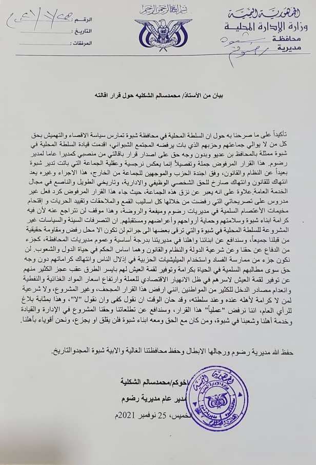مدير عام رضوم : قرار إقالتي يعكس نرجسية وعقلية جماعة الإخوان التي تدير شبوة بعيداً عن النظام والقانون