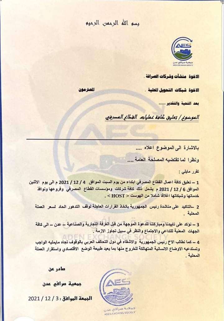 جمعية الصرافين تعلن تعليق كافة أعمال القطاع المصرفي وتطالب الرئيس والتحالف بالتدخل لإنقاذ الأوضاع الإنسانية المتهالكة