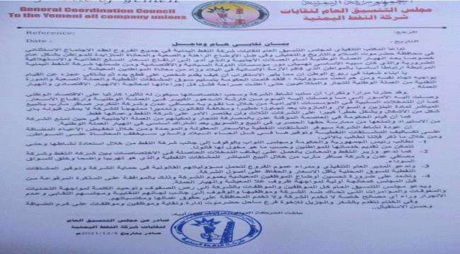 طالب المكتب التنفيذي لمجلس التنسيق العام لنقابات شركة النفط، الرئيس هادي وحكومة المناصفة بالوقوف إلى جانب شركة النفط من خلال استعادة نشاطها، وإيقاف التدخلات الحاصلة في الاختصاصات بينها وشركة مصافي عدن وشركة صافر مأرب. وقال بيان المكتب ان: "الحكومة قامت بتسليم سوق المشتقات النفطية والعملة الصعبة والدورة النقدية من العملة الوطنية للتجار والمتلاعبين حتى أعلنت صراحة فشل كل إجراءاتها لمعالجة الانهيار الاقتصادي وانهيار العملة". وحذر من أن سلب نشاط الشركة وسحب اختصاصاتها سيكون له تأثيرا كارثيا على الاقتصاد الوطني وصلت إليه الأمور إلى ما وصلت إليه اليوم من كارثة التدهور الكبير في العملة المحلية وارتفاع الأسعار. وقال: "كما أن التدخلات السلبية في المؤسسات الايرادية من خلال ما تقوم به مصافي عدن وشركة التكرير صافر مأرب بالبيع المباشر لمادة البنزين والسولار والمازوت يعد تجاوزا خطيرا ومخالفة للقانون وتدميرا ممنهجا للشركة لا يمكن قبوله باي شكل من الأشكال ويشكل خطراً كبيرا على الشركات الثلاث ولن يقتصر الأمر على شركة النفط وعمالها فقط". وأضاف: "كما أن قيام الحكومة في العاصمة عدن بالمصارفة للتجار وتمكينهم من العملة الأجنبية في حين تمنع الشركة من الاستيراد وتمنعها من ممارسة حقها الحصري في البيع والتسويق يعد اشتراك أساسي في انهيار العملة المحلية". وتابع: "إن عودة نشاط الشركة سيوفر المشتقات النفطية بالاسعار المعقولة والموحدة ومن خلال تخفيض الأعباء المضافة على تكاليف المشتقات النفطية وتوفيرها في كل أنحاء البلاد والذي سيخفف المعاناة على المواطن". واستطرد: "ومن خلال ماذكر فإننا نطالب بالآتي: 1- نطالب الرئيس هادي والحكومة بالوقوف إلى جانب شركة النفط من خلال استعادة نشاطها وحتي تتمكن من تقديم خدماتها للمواطنين وحسب ما هو مخول لها قانونا. 2- كما ندعو وزير النفط والمعادن بالعمل على إيقاف التدخلات الحاصلة في الاختصاصات بين شركه النفط وشركة مصافي عدن وشركة صافر مأرب من خلال البيع المباشر للمشتقات النفطية والذي هو تهريبا واضحا وخلق للسواق السوداء. 3- وندعو المدير العام التنفيذي ومدراء عموم الفروع لتحمل مسؤولياتهم القانونية في حماية الشركة وتوفير المشتقات النفطية للسوق المحلية بأقل الاسعار والحفاظ على أصول الشركة. 4- ونشدد على ضرورة تحسين أوضاع الموظفين المعيشة بعموم الشركة وذلك بالموافقة على المذكرة المرفوعة من قبل المجلس كمعالجة أولية لمواجهة ظروف غلا المعيشة وانهيار العملة. ويدعو المجلس التنسيق العام كل الموظفين والموظفات بالشركة إلى رص الصفوف وتوحيد الكلمة لمواجهة التحديات والمعوقات والمؤامرات التي تحاك ضد الشركة وموظفيها والوقوف إلى جانب لجانهم النقابية ومجلسهم النقابي وعدم الانجرار وراء أي مصالح خاصة لا تخدم الشركة ولا تخدم المحافظة على حقوق عمالها ومكتسباتهم.
