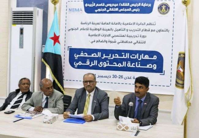 وفي الدورة التي حملت عنوان " مهارات التحرير الصحفي وصناعة المحتوى الرقمي"، ألقى الأستاذ فضل محمد الجعدي نائب الأمين العام للأمانة العامة لهيئة رئاسة المجلس الانتقالي، كلمة رحب فيها بالمشاركين من محافظتي شبوة، والضالع ، معبرا عن سعادته بتواجدهم في العاصمة عدن لتلقي المعارف العلمية والتطبيقية في الإعلام.