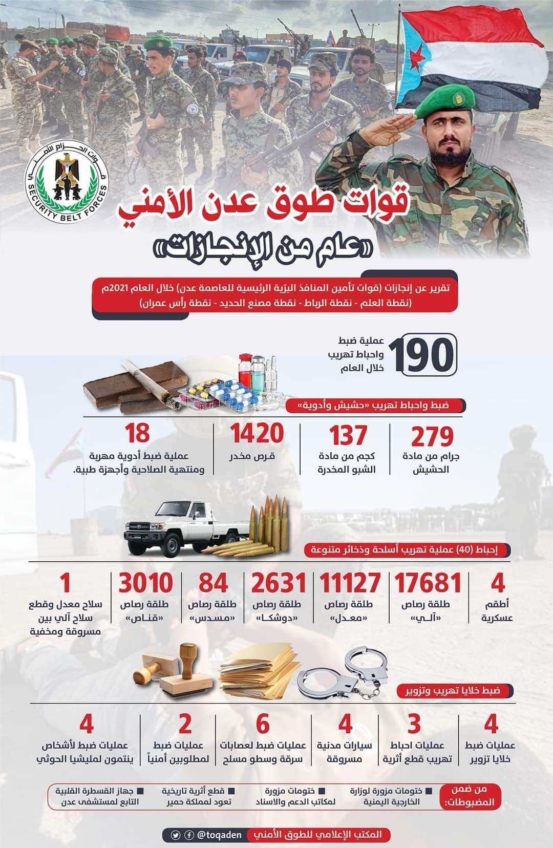 استعرضت قوات الطوق الأمني للعاصمة عدن، إنجازاتها السنوية خلال العام 2021م وقال قائد قوات الطوق الأمني العميد ناجي اليهري أن قوات الطوق بذلت جهودا كبيرة، وحققت الكثير من الإنجازات، منذ توليها تأمين المنافذ البرية الرئيسية للعاصمة عدن مطلع العام الماضي. مضيفاً: أن اجمالي عمليات الضبط واحباط التهريب بلغت (190) عملية، وكانت أبرز المضبوطات (278) كجم من الحشيش و (137) كجم من مادة الشبو المخدرة، وضبط عدد (1420) قرص مخدر، وتسجيل (18) قضية تهريب أدوية منتهية الصلاحية ومهربة ضمنها جهاز القسطرة القلبية التابع لمستشفى عدن. لافتاً ” انه تم إحباط (40) عملية تهريب أسلحة وذخائر متنوعة تقدر بـ (17681) طلقه رصاص آلي، و (11127) طلقة معدل، و (2631) طلقة رصاص دوشكا و(84) طلقة رصاص مسدس و (3010) رصاص قناص، إضافة لقطع سلاح متنوعة بين مسروقة ومخفية. وأشار “اليهري” إلى تمكنهم من استعادة (8) سيارات مسروقة، منها (4) سيارات مدنية، و (4) أطقم عسكرية، وأوقعوا بـ (4) خلايا تزوير ضمنها ضبط ختومات مزورة لوزارة الخارجية اليمنية، وختومات مكاتب الدعم والاسناد، وإحباط (3) عمليات تهريب قطع آثار تاريخية. وتابع: إلى أنه تم الإيقاع بعصابة سطو مسلح، وضبط عصابات سرقة في (6) عمليات متنوعة، والقبض على (2) مطلوبين أمنياً، إضافة لـ (4) أشخاص ينتمون لمليشيا الحوثي. وتطرّق اليهري إلى الكثير من الأدوار الأمنية والإنجازات التي حققتها قوات طوق عدن الأمني، العام الماضي. وأكد اليهري أن هذه الإنجازات تحققت بتوفيق من الله، ثم بجهود أفراد ومنتسبو طوق عدن الأمني، والدعم الذي يوليه سيادة الرئيس القائد عيدروس الزُبيدي القائد الأعلى للقوات المسلحة الجنوبية، وقائد الأحزمة الأمنية العميد محسن الوالي. معربًا عن شكره وتقديره، لأفراد وضباط طوق عدن في جميع المنافذ والنقاط الأمنية على امتداد خط التأمين البرّي للعاصمة عدن