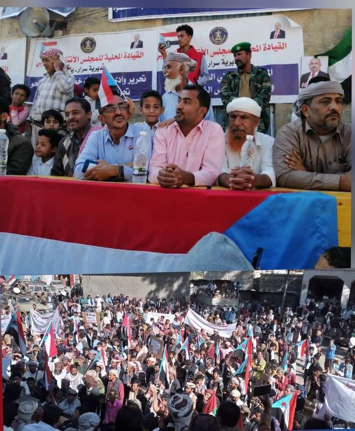 نظم المجلس الانتقالي الجنوبي مديرية سرار يافع محافظة أبين مسيرة حاشدة ومهرجان خطابي صباح اليوم الاربعاء الموافق ١٢ يناير ٢٠٢٢ م في مركز مديرية سرار حيث توافد المشاركون من أبناء مديرية سرار منذ الصباح الباكر للمشاركة في هذه المسيرة والمهرجان الخطابي الذي نظمه المجلس الانتقالي الجنوبي مديرية سرار في مركز المديرية وبمشاركة جميع مراكز ومناطق المديرية حيث جابت الحشود الجماهيرية شوارع المديرية رافعة اليافطات والاعلام الجنوبية ومرددة الشعارات الثورية التضامنية مع الهبة الحضرمية الثانية ومباركة الانتصارات التي حققتها ألوية العمالقة الجنوبية في تحرير محافظة شبوة من مليشيات الحوثي الاجرامية واختتمت المسيرة الجماهيرية الحاشدة بمهرجان خطابي حاشد القيت فيه الكلمات والقصائد الشعرية، وقد بدأ المهرجان بآيات من القرآن الكريم ثم النشيد الوطني الجنوبي ودقيقة حداد على ارواح شهداء الجنوب وتخلل المهرجان عدد من الكلمات كان في بدايتها كلمة للاستاذ علي ناصر الحامدي رئيس الهيئة التنفيذية للمجلس الانتقالي الجنوبي مديرية سرار يافع محافظة أبين رحب في مستهلها بالمشاركين من أبناء مديرية سرار في هذا المهرجان، مستعرضاً البطولات والانتصارات التي حققتها ألوية العمالقة الجنوبية في تحرير محافظة شبوة وتضامناً مع الهبه الحضرمية. كما ألقى الاستاذ عبدالرقيب يسلم الشنبكي عضو الجمعية الوطنية نائب رئيس اللجنة الجماهيرية بالجمعية الوطنية كلمة اشاد بها بالمشاركين بهذا المهرجان مباركا الانتصارات التي حققتها ألوية العمالقة الجنوبية في تحرير محافظة شبوة ومشيداً بالدور السياسي الذي يسطره المجلس الانتقالي الجنوبي بقيادة اللواء عيدروس قاسم الزبيدي رئيس المجلس الانتقالي الجنوبي القائد الأعلى للقوات المسلحة الجنوبية على كافة الأصعدة السياسية. كما القيت في المهرجان قصائد شعرية للشاعر امين الكلدي والشاعر حمصان أثارت حماس الجماهير. حيث خرج المهرجان ببيان ختامي القاه رئيس الدائرة السياسية بانتقالي سرار الشيخ صالح حسن المنصري والذي تضمن تأييد ومباركة أبناء مديرية سرار للهبة الحضرمية الثانية لانتزاع حقوقها الطبيعية من ثروات وخيرات وحقها في سيطرتهم العسكرية وإدارة المؤسسات الأمنية والعسكرية في حضرموت. وثمن البيان الانتصارات التي تسطرها القوات الجنوبية المسلحة المتمثلة في ألوية العمالقة والمقاومة الجنوبية في تطهير مديريات محافظة شبوة. كما ترحم على أرواح الشهداء الذين روت دمائهم أرض شبوة الجنوبية وكان لأبناء مديرية سرار نصيبها من هذه الدماء بين شهيد وجريح. كما اشاد البيان بالدور الدُبلوماسي الذي يلعبهُ الوفد المفاوض في الرياض برئاسة الرئيس القائد عيدروس قاسم الزُبيدي القائد الأعلى للقوات المسلحة الجنوبية ، مثمناً بالوقت نفسه المواقف الأخوية لدول التحالف العربي ممثلة بالمملكة العربية السعودية ودولة الإمارات العربية المتحدة صادر عن الإدارة الإعلامية للمجلس الانتقالي الجنوبي مديرية سرار