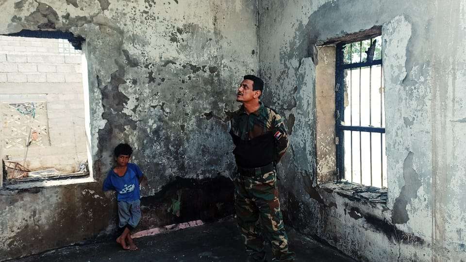 أركان حرب اللواء الثامن صاعقة يطلع على حجم الأضرار التي الحقتها النيران بأحد المنازل بمنطقة باجدار بمديرية زنجبار.