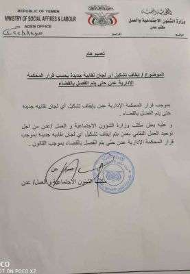 أصدر مكتب وزارة الشؤون الاجتماعية والعمل في العاصمة عدن تعميما هاما بإيقاف تشكيل أي نقابات جديدة بمرافق الدولة في العاصمة عدن بناء على قرار المحكمة الإدارية/ عدن، حتى يتم الفصل بقضية النقابات من قبل القضاء.