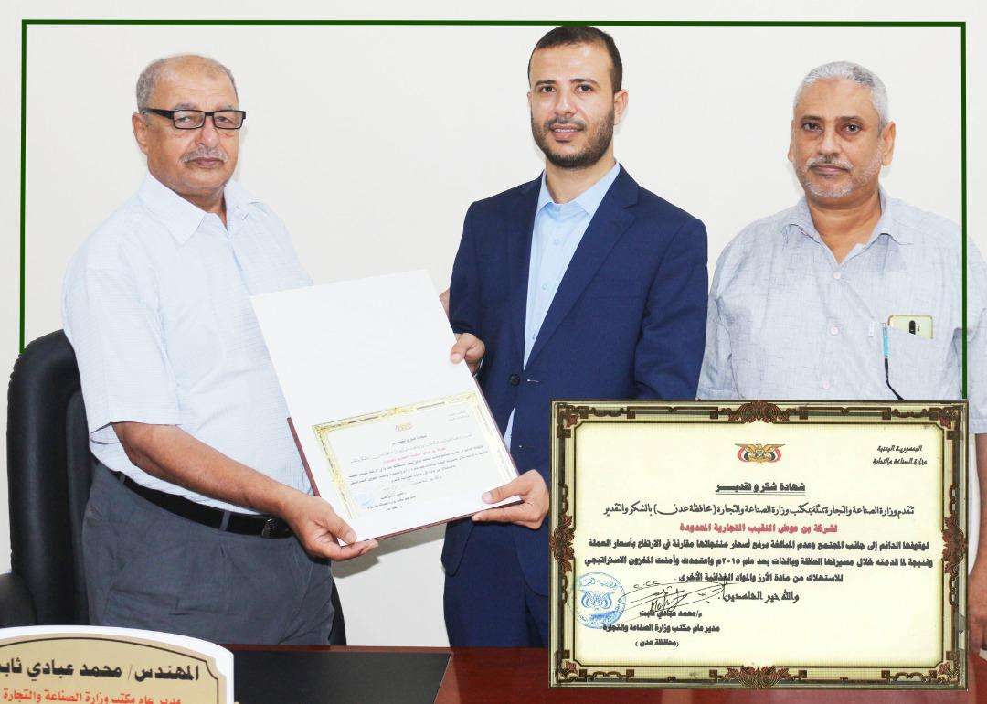 وزارة الصناعة والتجارة تكرم شركة تجارية في عدن.