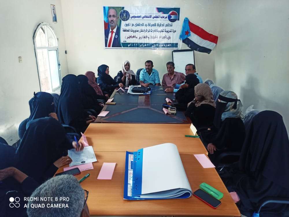 إدارة المرأة والطفل بانتقالي أبين تنظم دورة تدريبية تنظيمية لمدراء إدارات المرأة في المحافظة في إعداد الخطط والتقارير والمحاضر.